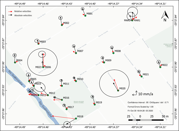 Regarding the velocity field obtained for the study area, a local displacement of the southern zone near the Guabirotuba River could be observed, probably as a result of a local landslide process or the geomorphological composition of the area. A clear discontinuity is also observed in the vertical component of the time series. This is probably correlated to the existence of a local physical process, which in turn produce relative velocities of several centimetres per year in the up component of some stations (that is, M004, M006, M015, M016) (Table 4).