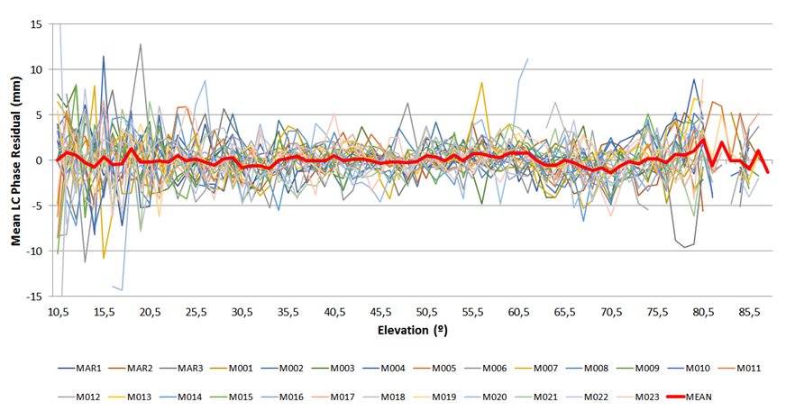 For all sites, it is possible to see that the pattern of their phase residuals remains relatively constant over time, with the higher oscillating phase residuals (up to 10 mm) at low elevations, probably, as a result of multipath effects, but generally without influence on station displacement estimates.