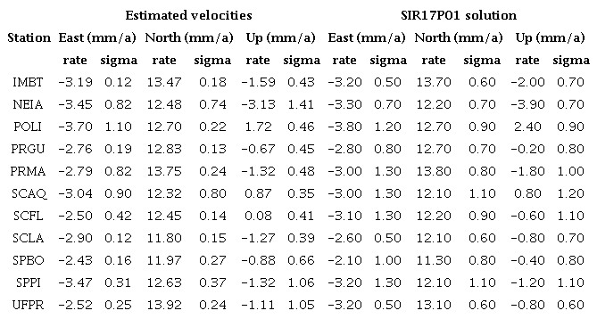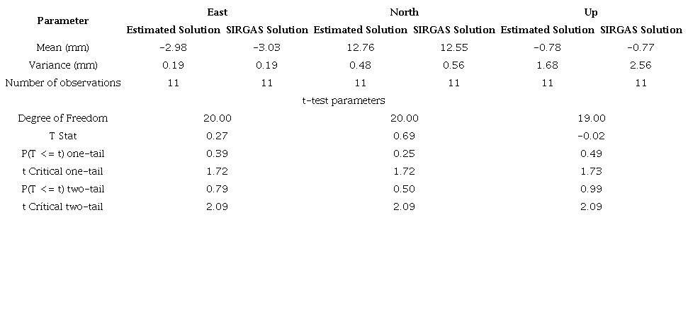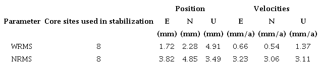 This can also be evidenced through the repeatability analysis. For that, Table 3 shows the repeatability of the final combined solution, which also are in accordance with minimum levels established for GPS survey sessions (i.e. ±2-4 mm for horizontal coordinates and ±10-15 mm for heights) and in the same magnitude of the SIRGAS coordinate and velocity accuracy (i.e. ±2 mm horizontally and ±5 mm vertically for the station positions at the reference epoch, and ±0.8 mm/a horizontally and ±1.2 mm/a vertically for the constant velocities), which ensures the reliability of the solutions.