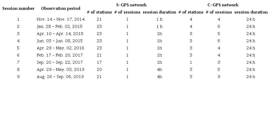 Recent advances in the development of the different satellite positioning systems, have led them to become a key element in the study of the different physical Earth processes. The ability of Global Navigation Satellite Systems (GNSS) to estimate high accuracy 3D positions has contributed greatly to the development of new monitoring techniques aimed at understanding how different tectonic and geological processes affect the Earth surface and fundamentally, to explain how these mechanisms impact the society and the environment (Bock and Melgar 2016). One of the main applications that currently make use of GNSS is the study and monitoring of geophysical phenomena (e.g., tectonic motion, fault zones, landslides, subduction processes, and volcanoes) (Luna et al. 2017, Duman and Sanli 2019, Sánchez and Drewes 2020). In this scenario, GNSS observations play an important role, since they provide estimates of crustal deformation with respect to a global terrestrial reference frame, while also provide constraints of the nature of the forces acting on the Earth surface (Lambeck 1988). Most of the innovative studies conducted in recent years, in which GNSS velocity fields are used to analyse tectonic and geodynamic processes, are based on the use of continuous GPS data (i.e., 24 h sessions) (Zhang et al. 1997, Mao, Harrison, and Dixon 1999, Dixon et al. 2000, Langbein 2004, Vernant et al. 2004, Serpelloni et al. 2013, Williams 2015, Choudhury et al. 2018, Duman and Sanli 2019). In all of them, their objective is the study of the stochastic properties of data in order to minimize the effect of long-range time-dependent correlation noise and establish a more realistic uncertainty of the velocities (Williams 2003, Pilapanta, Krueger, and Criollo 2018). Despite the good results achieved with this method, the need to study geophysical processes at local scales (i.e., landslide and subduction urban area processes) and the impossibility of carrying out campaigns with long duration (i.e., 12 to 24h session), has led to the use of so-called “repeated GPS measurements” (i.e., GPS campaign measurements with just a few hours of observation). An example of this is the study performed by Duman and Sanli (2019), who analysed the incidence of employed GPS campaign measurements with only 1-8 hours observation sessions for the calculation of velocity fields compared to the use of continuous data. The results revealed that through the definition of a robust local geodetic network formed by the combination of permanent (continuous measurements) and semi-permanent (repeated measurements) sites, 85% of the horizontal velocities were comparable to the accuracy derived from 24 h campaigns. Based on these studies and to analyse possible landslide processes, in this paper we examine the data obtained in nine survey-mode GPS campaigns carried out between 2014 and 2019 for a group of 29 GPS sites, divided into a survey (multi-period GPS sites) and a core (continuous GPS sites) local network and with sessions lasted from 1 to 24 hours.