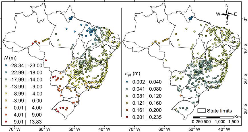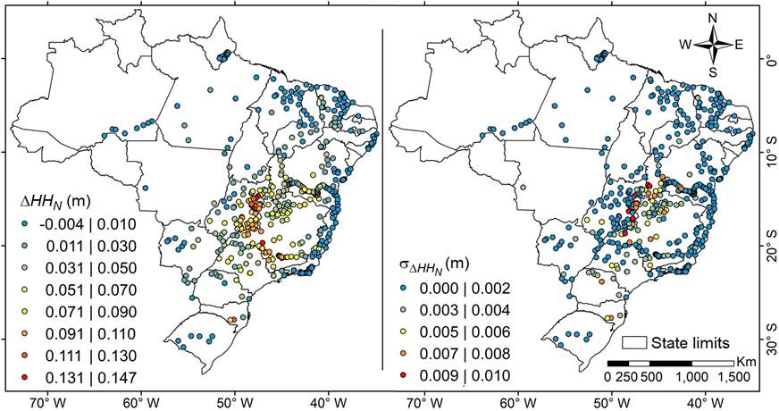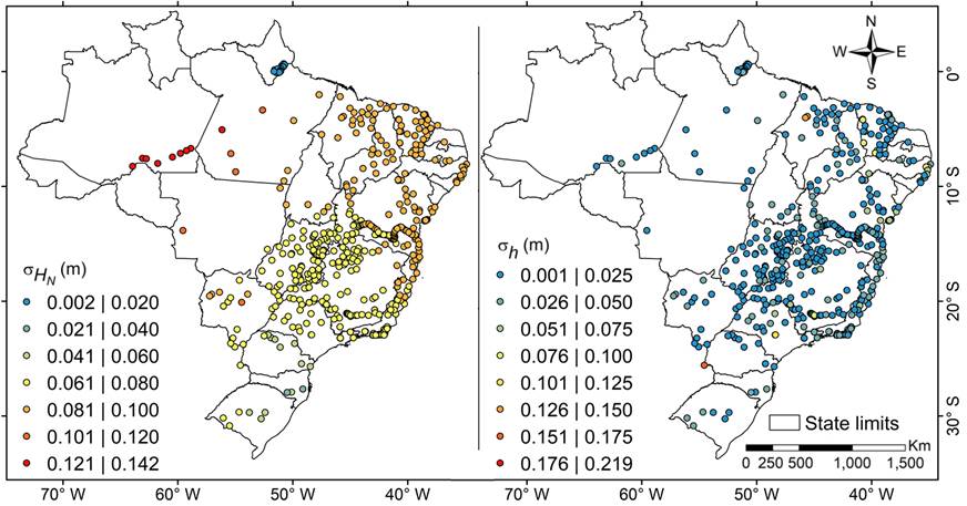 From the results presented in Figures 6, 7, 2 and 8, we observe a great influence of the normal heights uncertainties on our estimates. Normal heights uncertainties are smaller for the RAAP stations closer to the vertical datum of Imbituba and Santana, defined for the SGB. Here, it is important to mention that the Santana vertical datum is used only for stations located near or the north the Amazon River, while the Imbituba vertical datum is used for all other stations located in the Brazilian territory.