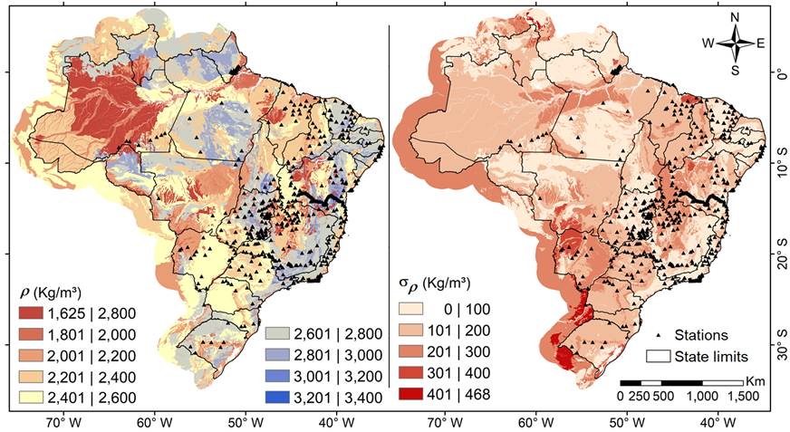 Following Hinze (2003) and Sheng et al. (2019), for ρ±σρ constant, we use the average value of 2670±800 kg/m3. For ρ±σρ variable, we use values from the LTD_Brazil model when we are inside the study area (Brazil), and density values from the UNB_TopoDensT model for regions outside (Figure 3). In addition, for the oceanic region, we assume H = 0 m for the mean sea level and a seawater density value of 1030±0 kg/m3 (García-Abdeslem 2020).