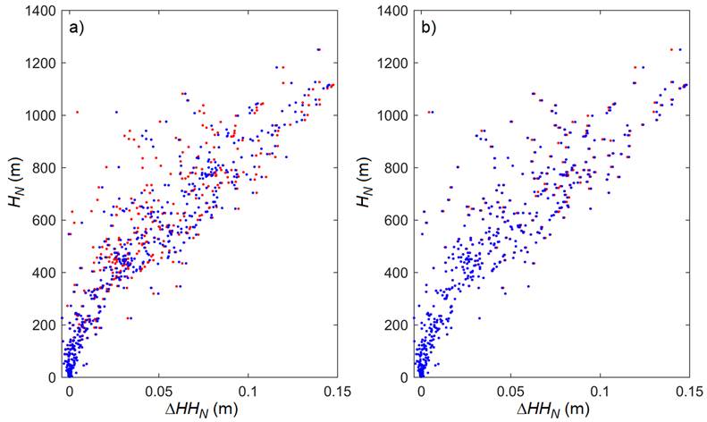 Finally, when analyzing Figures 6, which shows differences between H and HN greater than the estimated uncertainties, it is possible to suggest that both heights are statistically different when 1 or a 68.3% confidence level is taken into account.