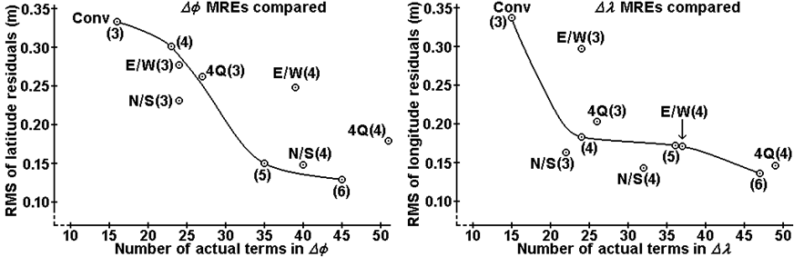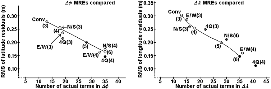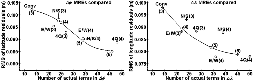Figure 2 shows that N/S is superior to E/W and 4Q for both (( and (λ. This may be because the north-south extent of Great Britain is greater than its east-west extent. Three out of four of the N/S MREs are superior to interpolated “Conv”. (Table 5 will provide further comparisons, both in terms of accuracy and simplicity for a given level of accuracy.)