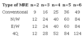 The attraction of E/W MREs is that they allow more low-order terms than conventional MREs. As in the case for N/S MREs, there are possible terms for which , and this number is shown in Table 1 for different values of n.