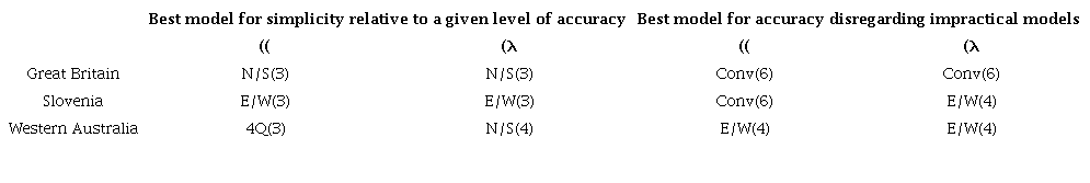 Figure 4 shows that no single type stands out overall for Western Australia. For ((, 4Q is superior to E/W, and both are superior to N/S and interpolated “Conv”. (Table 5 will provide further comparisons, both in terms of accuracy and simplicity for a given level of accuracy.)