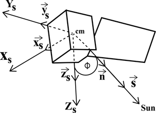 f, is the angle between the satellite-Sun vector and the unit vector are the unit vectors in the CBERS 04A-fixed reference system, as shown in Figure 2.