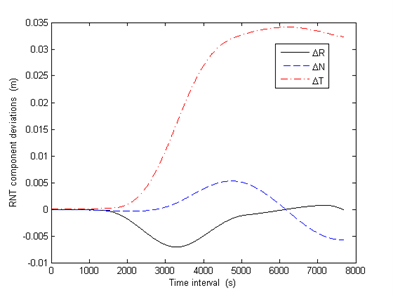 The variations of the RNT components of the position are shown in Figure 3. On the axis of time, the reference epoch is 12h 06m 02s UTC January 11th 2021 and the time interval is 10 seconds. The transverse component is the most affected one, where the deviation amounts to 0.032 m in 128 minutes, while the radial component deviates around -0.000097 m and the normal component deviates around -0.0058 m.