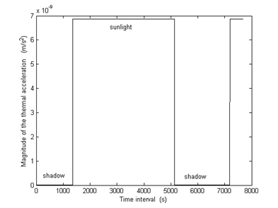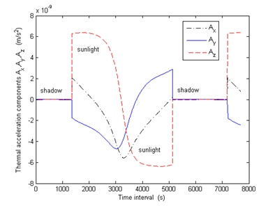 In Figure 4 it is shown the amplitude variations of the thermal reemission acceleration components Ax, Ay and Az, respectively. Concerning the amplitude of the accelerations when satellite is in sunlight period the components of the thermal acceleration can have positives and negatives amplitude, with values on the order of 10-9 m/s2. When the satellite is under the shadow period (approximately 34 minutes), during the cooling and the heating processes, the values of the components decline on the order of 10-13m/s2. This fact is due to thermal equilibrium and it means that in shadow, the period that the thermal reemission force has effect on the satellite trajectory. The magnitude of the perturbation acceleration is in the range of A = 6.858 x10-9 m/s2 when the satellite is in sunlight and A = 1.083x10-13 m/s2 when it is under the shadow, according to Figure 5.