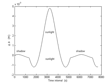 In Figure 6 it is showed the differences of semi-major axis (Δa) due to the thermal perturbation effect and can be seen that such effect produces a small oscillation around 4.8x10-3 m when the satellite is in sunlight. When the satellite enters into shadow, the value is around -2.7x10-4 m, then it drops to -6.19x10-7 m and after exiting the shadow the value is around -0.00026 m. The changes of these values are due to thermal equilibrium of the solar panels.
