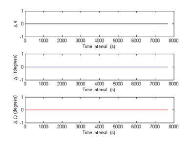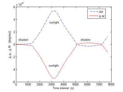 Figure 7 shows that the differences Δe, Δi and ΔΩ are not affected by the thermal reemission force and in Figure 8 it is possible to observe that Δω and ΔM are affected by a small oscillation with maximum amplitude on the order of 10-4 degrees when the satellite is in sunlight and 10-5 degrees when the satellite is in the shadow.
