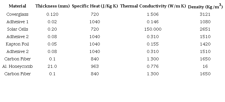 The value of τp is on the order of 1 second which leads solar panels to reach thermal equilibrium as soon as they enter into Earth’s shadow and returns instantly the former thermal configuration when it leaves the shadow. The Relaxation time was determined by Equation 7 with the values defined in Table 3.