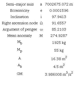 The initial conditions required to solve numerically Equation 9 and Equation 10 is given in Table 4. The orbital elements are obtained from TLE (NASA/NORAD (2020) (Two-Line Element at 12h 06m 02s UTC January 11th 2021) and transformed in state vector (). The step-size (Δt) used was 10 seconds, the total propagation time of these equations was 7680 seconds (128 minutes) and one assumes that temperatures of the satellite’s body and solar panels do not change throughout the satellite’s orbit.