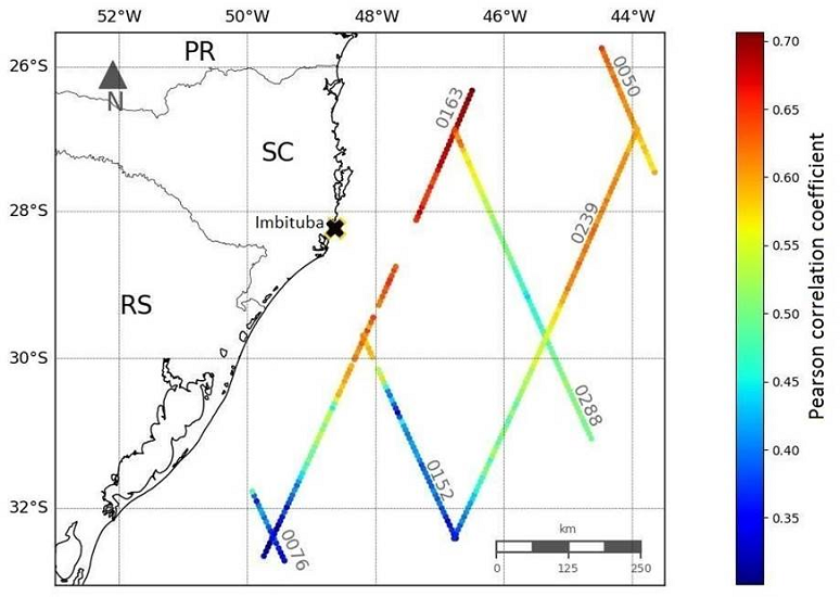 As seen earlier, we correlated the tide gauge data with each SSH cell along the tracks of the TOPEX/Poseidon, JASON 1, 2, and 3. Thus, considering a 500 km radius from the tide gauge, we demarcated 363 cells along tracks 0050, 0076, 0152, 0163, 0228, and 0239.