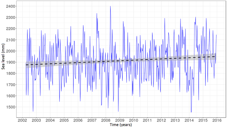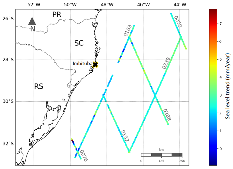 Regarding mean sea level variation, we observed that the mean values for vSA (1992-2017) and vTG (2002-2015) were 2.5 mm/a ±1.2 mm/a and 5.4 mm/a ± 1.9 mm/a, respectively, while the mean values for vSA (2007-2015) and vTG (2007-2015) were 7.1 mm/a ± 4.6 mm/a and 13.0 mm/a ±4.2 mm/a. The use of longer SSH time series and tide gauge data allowed us to reduce the value of the regression standard error, which provides a closer match of the regression line to the observed data.