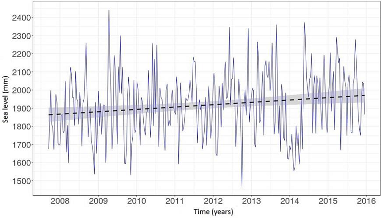 By analyzing the regression line of tide gauge data between 2002 and 2015 (Scenario 1), presented in Figure 4, we found a mean sea-level trend of 5.4 mm/a ±1.9 mm/a. For the period from 2007 to 2015 (Scenario 2), we estimated a sea-level of 13.0 mm/a ± 4.2 mm/a, as shown in Figure 5. Between the middle of 2013 and the middle of 2014 there was an apparent decrease and then a rise in sea level. Therefore, it is important that the period of time covered in the mean sea level analysis is as long as possible. In addition, further studies about possible instrumental effects on the tide gauge data time series are needed.