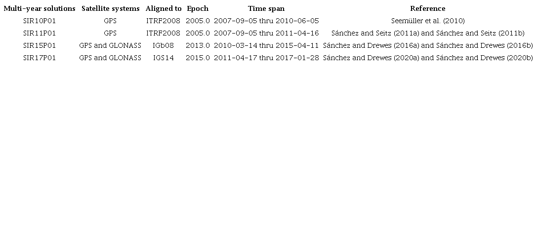Sánchez L. and Drewes H. 2016a. SIR15P01: Multiyear solution for the SIRGAS Reference Frame, open access. DOI: 10.1594/PANGAEA.862536.