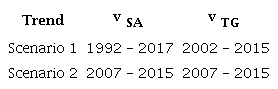 Table 4 presents the results of vTG and vSA for the periods 2002 to 2015; 1992 to 2017, respectively (Scenario 1). The mean values of vTG and vSA were 5.4 mm/a ± 1.9 mm/a and 2.5 mm/a ± 1.2 mm/a, respectively.