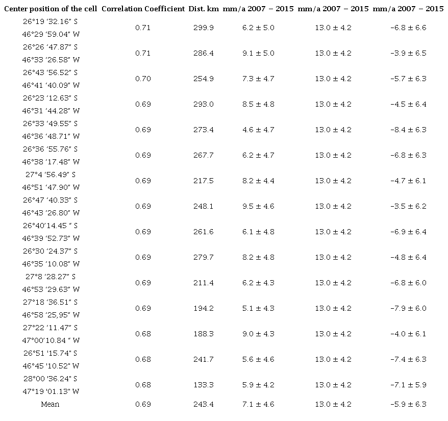 Table 3 presents the results of vTG and vSA between September 2007 and December 2015 (Scenario 2). The mean values of vTG and vSA were 13.0 mm/a ± 4.2 mm/a and 7.1 mm/a ± 4.6 mm/a, respectively. The negative signs of vU characterize a descendent VLM of the crust, i.e., possible crustal subsidence.