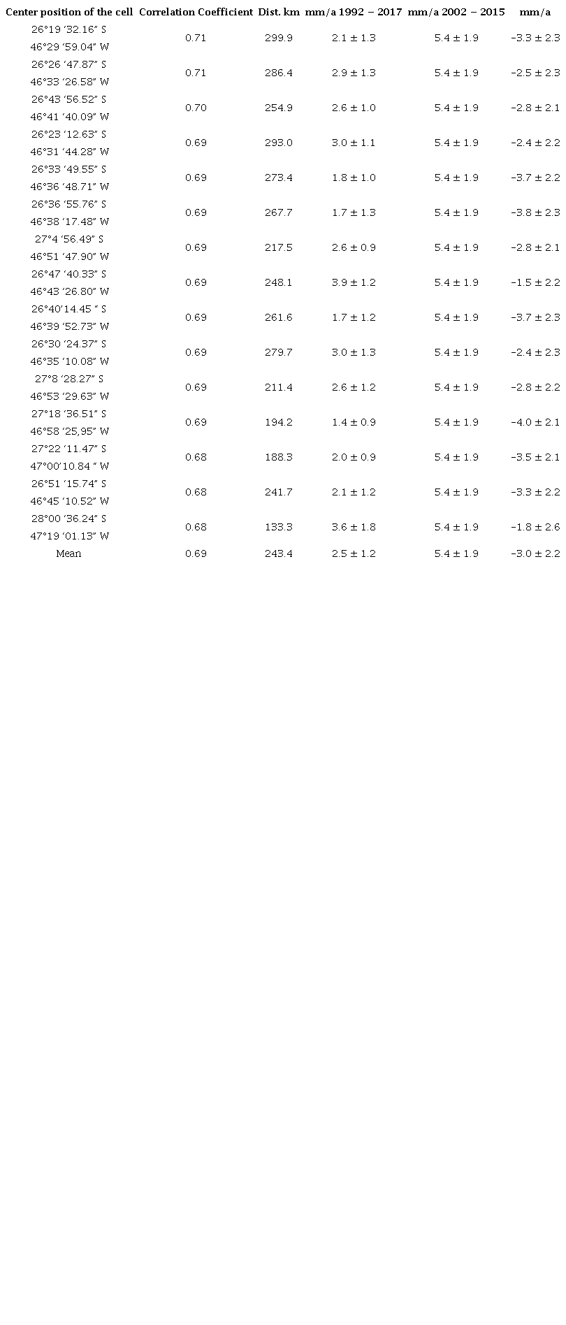 Finally, we applied the linear regression model to the 15 cells that showed a correlation coefficient greater than 0.69 which equates to a moderate to strong correlation according to Shimakura (2006) in order to determine the linear trends of sea level variation observed by satellite altimetry missions in relation to the Earth’s geocenter (vsa ).