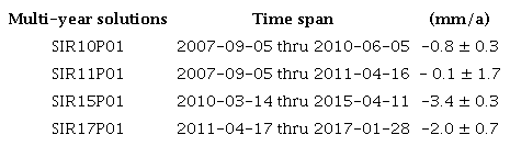 Table 5 presents the values of vGNSS related to four SIRGAS Multi-year solutions at different periods: SIR10P01 (2007-2010), SIR11P01 (2007-2011), SIR15P01 (2010-2015), and SIR17P01 (2011-2017). It was noted that vGNSS showed close values for the time periods with the most overlapping data, that is, SIR10P01 (2007-2010) and SIR11P01 (2007-2011) solutions had values of -0.8 mm/a ± 0.3 mm/a and - 0.1 m/a ± 1.7 mm/a, respectively, while solutions SIR15P01 (2010-2015) and SIR17P01 (2011-2017) had values of -3.4 mm/a ± 0.3 mm/a and -2.0 mm/a ± 0.7 mm/a, respectively. All solutions presented a trend of crustal subsidence in Imbituba.
