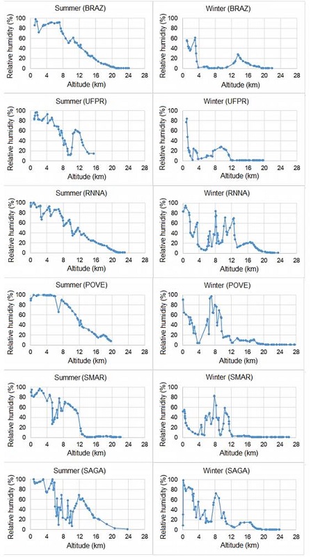To study the effect of tropospheric refraction on the positions, the same evaluation was sought in different scenarios of the neutral atmosphere. That is, in different regions of the Brazilian territory, in the summer and winter periods. For this, it was considered data from the active stations of the Brazilian Network for Continuous Monitoring of the GNSS Systems (RBMC) (IBGE, 2021). In addition, it was obtained values of the climatological variables (temperature and rainfall) from the CPTEC/INPE. Relative humidity values (%) in atmospheric layers from radiosonde data from the Department of Atmospheric Sciences of the University of Wyoming. Both data are made available free of charge to users from the institutions’ websites. To choose the areas of study, this research considered locations with different climatological characteristics and used the radiosonde data to select the day with higher humidity in January and the day with less humidity in July for each RBMC station. These radiosonde data were not directly used in GNSS positioning. Some of the atmospheric data sources for the development of the research are presented in Table 1.