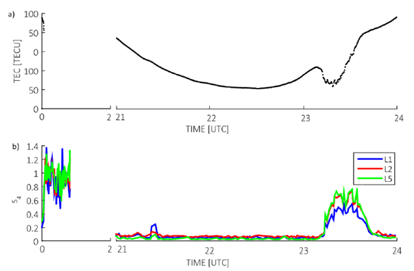 In order to show the influence of the scintillation in the S4 values, Figure 2 shows one example of the slant TEC estimated and the S4 values at the L1, L2 and L5 signals for PRN 25 on November 27, 2014 (DOY 331). The slant TEC was obtained using calibration procedures such as Ciraolo et al. (2007) and Prol et al. (2018). The technique is based on the code-delay to the carrier-phase by the so-called levelling process, applied to reduce carrier-phase ambiguities from the data.