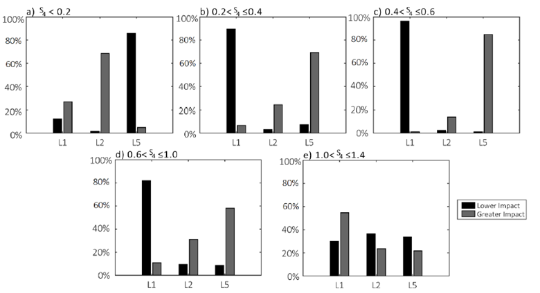 To perform a quantitative analysis, we considered the S4 data classified in each scintillation level to identify which frequencies suffer the greatest and the least impact. In other words, greatest and least impact means that signal presents the highest and least S4 values compared to the other signals. Figure 3 presents the percentage of the epochs in which each frequency suffered the greatest and the least impact, the sum for each frequency must be 100%.