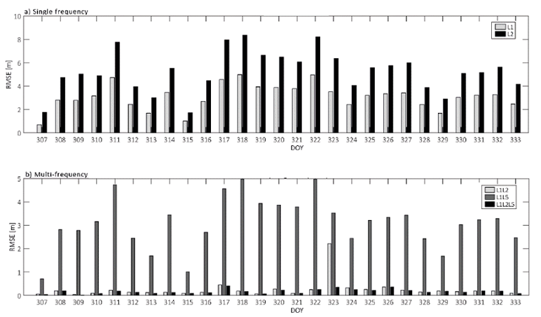 The influence of the use of single or multi-frequency data in the positioning can be noticed in all obtained results. The RMSE values considering single frequency positioning are twice the RMSE values considering the dual frequency positioning. Concerning the single frequency positioning the RMSE obtained from L2P signal (dark color) presented larger errors compared to L1 signal (light grey color). This behavior can be explained due to the ionospheric error is inversely proportional to the squared frequency. Considering the multi-frequency positioning the RMSE obtained from L1-L5 (dark grey color) presented larger errors compared to L1-L2P (light grey color) and L1-L2P-L5. This can be explained due to the use of the linear combination of multi-frequency observables, which mitigates the ionospheric first order influence. In addition, the RMSE obtained by the L1-L2P and L1-L2P-L5 presented similar values, except for DOY 323. In order to summarize the results, we estimated the mean of RMSE considering the different GPS frequencies. The results are present in Table 3.