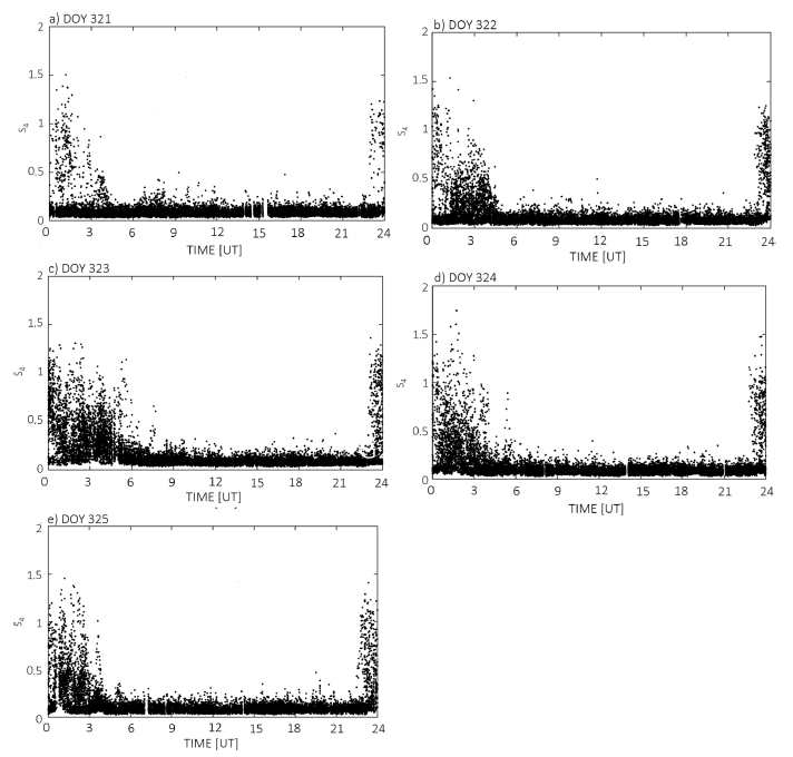 For the quantitative analysis, the S4 index was obtained using the ISMR Query Tool (Vani et al., 2017). The S4 was calculated from measurements performed at the three GPS frequencies: L1 (1575.42 MHz), L2 (1227.60 MHz), and L5 (1176.45 MHz). The values were limited to measurements from satellites with elevation angle higher than 20°, considered above the level of noise and multipath effects.