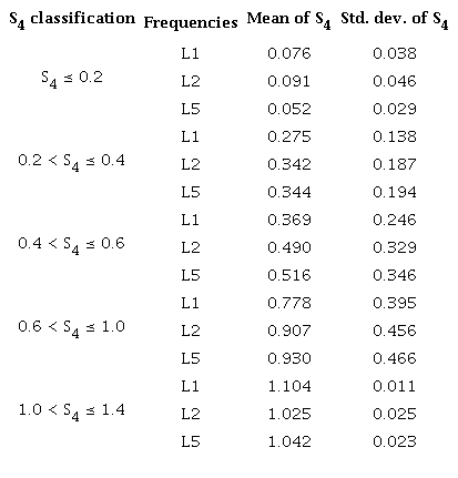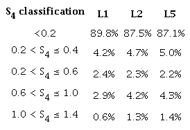 The parameter used in these analyses was the amplitude scintillation index - S4, which is the main statistic for indicating the severity of the amplitude scintillations. In this paper, we considered the same limits used by Muella (2009) for the S4 index classification: weak level 0.2 < S4 ≤ 0.4; moderate level 0.4 < S4 ≤ 0.6; strong level 0.6 < S4 ≤1.0; and saturated level 1.0 < S4 ≤ 1.4. According to Muella (2009), saturated levels can be attributed to the effects of multiple scattering and means that the S4 is not due to a single scatter of the radio wave.