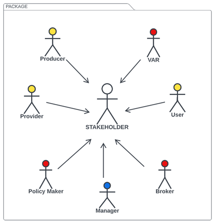 The use case diagram below (Figure 3) illustrates the stakeholders’ initial and general roles and the reorganisation applied according to their needs. The conceptual model allows an individual or an organisation to have more than one role and shows that their functions can be transferred to or overlap with others. For example, the IDE-AMB proposal is that a stakeholder can be assigned a consumer, producer, and user data provider role. In this sense, the Value-Added Reseller (VAR) role - in red in Figure 3 - was suppressed since its aggregator function can be performed by Providers, Producers, and Users (in black).