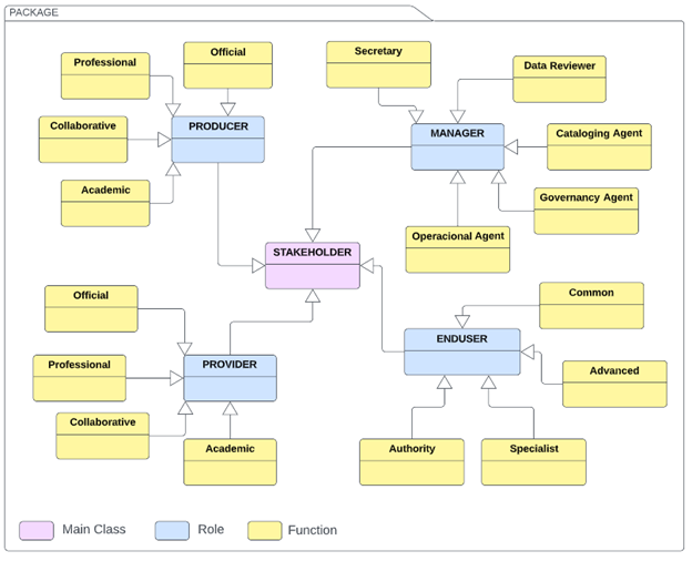 With the increase in spatial data availability and the possibility of integrating voluntary geographic information (VGI) into an SDI, stakeholders’ roles were reviewed, and the Reference Model was extended through functions called “subtypes” and “sub-subtypes” by Cooper et al. (2011). From this perspective, Béjar et al. (2012) extended this model by considering the relationships between the SDI and the interactions affected by the policies and the adoption of the UML4ODP profile to describe the model from an enterprise viewpoint. Based on these extensions and adaptations, Oliveira and Lisboa-Filho (2017) proposed a new version with seven main roles that the actor can assume and interact within a corporate SDI.