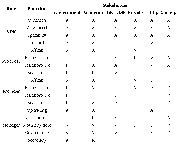 The horizontal axis shows the different stakeholders organised in common groups, as described in the previous section, according to their needs for access, use, production, and provision of geospatial data, as well as their involvement with the management of the IDE-AMB.