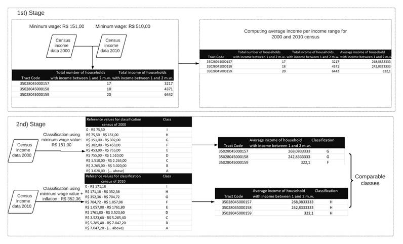 In this paper a methodology for harmonizing income MW categories from 2000 and 2010 Brazilian censuses was proposed. MW categories from 2010 are adjusted using the 2000 MW as a reference, adjusted for inflation. The adjusted classification provides a more accurate view on income distribution in 2010. It also allows more intuitive comparison between 2000 and 2010 IBGE’s census income data. The methodology was developed to be applied to aggregated data in the smallest available aggregation unit (census tract) allowing intra-urban comparative analyzes without loss of spatial resolution of the data, which commonly happens with methodologies that use the total population composition of the study area.