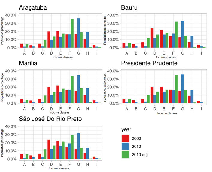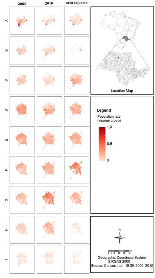 Abstract: Income variables from the Brazilian population census (IBGE) are often used as proxies for the population’s socioeconomic level in spatial analyses of urban segregation, inequality and social exclusion. However, income variables are dependent on reference values (minimum wage) that change over time, which can be challenging for multitemporal analysis. This paper discusses this issue and proposes a methodology to adjust income data that allows a meaningful comparison between the datasets of two Census periods. The methodology was applied to five medium-sized cities of the state of São Paulo by adjusting income data from Census 2000 and 2010 according to the period’s inflation rates. The analysis shows that the methodology mitigates the comparability issues. Results better reflect the changes in population composition and in residential patterns of different income groups that took place over the 2000s in Brazil in medium-sized cities.