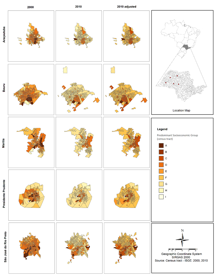 The predominant socioeconomic group map of 2010 adjusted for inflation, also in Figure 5, presents a pattern more in line with the decreased income inequality of the period. In those maps, areas predominantly occupied by lower income households (class I or income between 0 to 0.5 m.w.) are almost completely absent. Areas predominantly occupied by the higher income households (classes A and B) also have decreased. Conversely, there is a greater predominance of middle-income classes (classes G and F) in a greater number of census tracts in all cities of the study area.