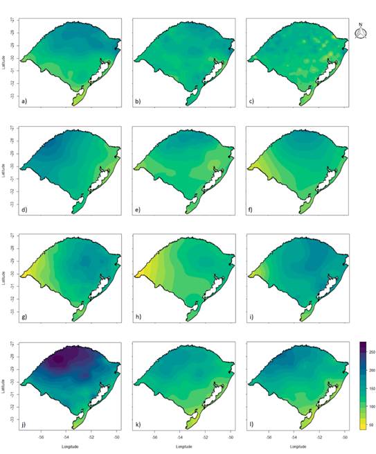 Figure 2 shows the kiging maps for the twelve months of the year, where it is observed that there is a greater amount of rain in the northern region of the state of RS. In January, February, June, July, August, and September, the highest average rainfall is predicted in the north and northeast of RS. In March, April, May, October, November, and December, rainfall is predicted with higher average volumes in the north and northwest of RS. The central and northern regions of RS form the significant agricultural area for the cultivation of corn (BERLATO, FARENZENA and FONTANA, 2005) and soybean (BERLATO and FONTANA, 1999). Berlato, Farenzena and Fontana (2005) highlight that the most important rains in the agricultural calendar for corn are from October to March in the state of RS. As for soybeans, rainfall variability is more relevant from December to March (BERLATO and FONTANA, 1999).
