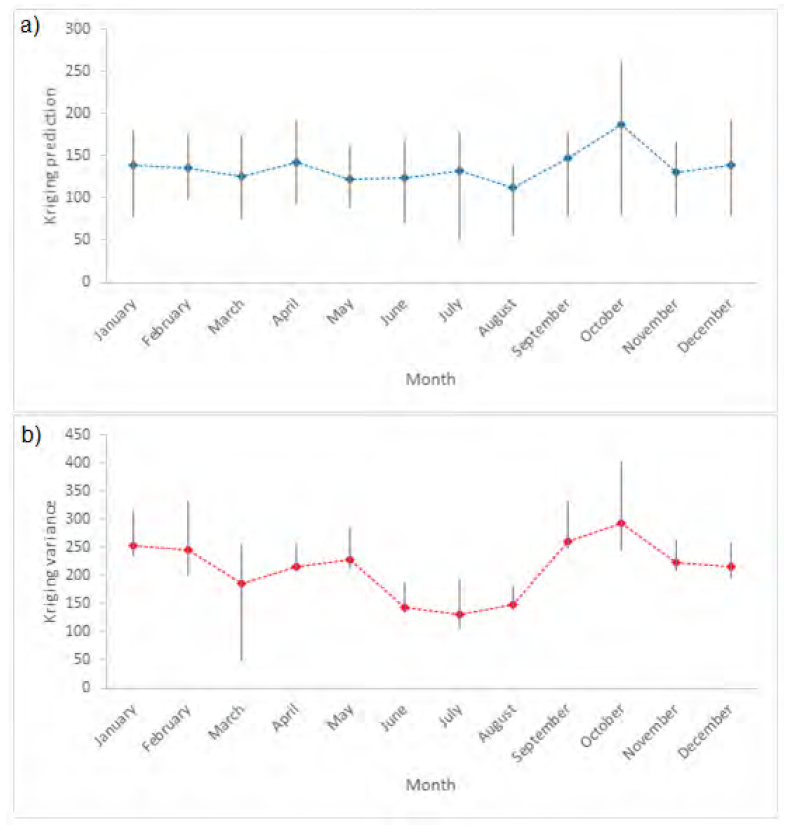 In Figure 4, the kriging predictions are similar, on mean, for all months of the year, except for October. October has the highest average predicted precipitation, but greater amplitude is also observed with places with minimum and higher rainfall.