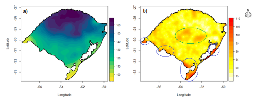 In addition, Figure 5 shows the behavior of the estimated kriging variance, in general, and the location of possible candidate regions to receive new rainfall stations in Rio Grande do Sul. It can be seen that the areas close to the coast, to the south and west of RS, which are circled in blue on the map, are those with the greatest kriging variances, indicating greater uncertainties associated with rainfall estimates (orange to red color scale). Cigagna et al. (2015) comment that uncertainty increases as it moves towards the edges of the area where the sampling grid is smaller (less dense).
