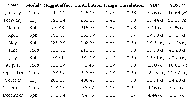 The fits of the semivariogram models are adequate, efficiently describing the behavior of the spatial variability structure, with correlation coefficients (between semivariances and the values predicted by the model) of at least 0.94, indicating optimal fits. The exceptions are the months of March and December, for which there are correlation coefficients of 0.73 and 0.87, respectively, which indicates slightly less efficient adjustments, but still good adjustments (Table 1).