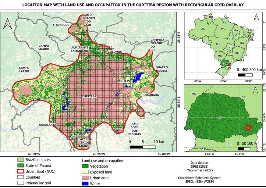 This study area covers a part of the NUC of the Metropolitan Region of Curitiba (Região Metropolitana de Curitiba, RMC), located in southern Brazil. As described by COMEC (2022), the RMC has 3.223.836 inhabitants, Brazil’s eighth most populous metropolitan region. In addition, it is the second-largest metropolitan region in the country, with an extension of 16.581,21 km². Figure 1 presents a location map of the study area.