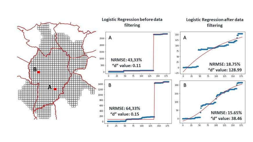 Figure 10 presents the behavior of the logistic curve in different cells before and after the filtering of the OSM tag key “addr:street”.