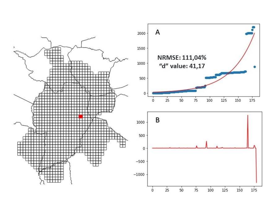 A critical issue observed in Figure 13 was the presence of two cells in a specific region of Curitiba where the calculated percentage exceeded 100%. In these regions, there was a representative exclusion of features in the most recent month evaluated. Figure 13 shows the data patterns for this region. Graph A of Figure 13 presents the adjustment of the data from the logistic regression, and graph B corresponds to the number of features inserted or excluded by month. In the most recent month, 1319 features were excluded, and this value converges to the most significant number added (1265 features). This fact is most apparent in graph B, considering that there are two extreme peaks of addition and exclusion. However, the curve in graph A indicates that this is a typical growing cell (Zone II). The modelling of the curve has not yet adapted to this abrupt decrease, probably because the exclusion was in the later epochs of the study period and because of the short relative time gap between the contribution spike and its exclusion. Nevertheless, this characteristic corroborates the initial premise of data heterogeneity and that Spatio-temporal patterns can vary according to the evaluated period and region. All analysis results, with graphs for the 1074 cells of the region, can be interactively consulted at https://bit.ly/NUC_notebook .