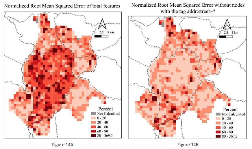 The maps shown in Figures 14A and 14B depict the spatialization of the NRMS obtained in each cell before and after filtering the “addr:street” tag key.