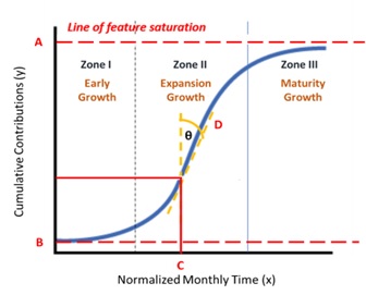 In Equation 1, parameters a, b, c, and d model the curve and represent the upper asymptote, lower asymptote, midpoint of the logistic curve (on the x-axis), and steepness of the logistic curve. The x value refers to the normalized monthly value, and y represents the accumulated number of features inserted in OSM. Figure 2 shows the logistic curve parameters and zones.
