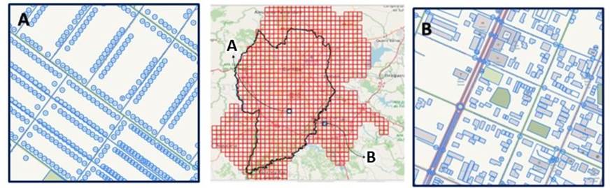 As shown in region A of Figure 3, it is possible to observe the set of point features around the blocks. Such elements correspond to the address information of each parcel available in the region. IPPUC (2022) provides, in shapefile format, more than 300.000 parcels in the municipality with their respective addresses available. It is worth noting that Brazilian municipalities do not commonly make such data available, including those belonging to the NUC. For example, in region B of Figure 3, there were no address points.