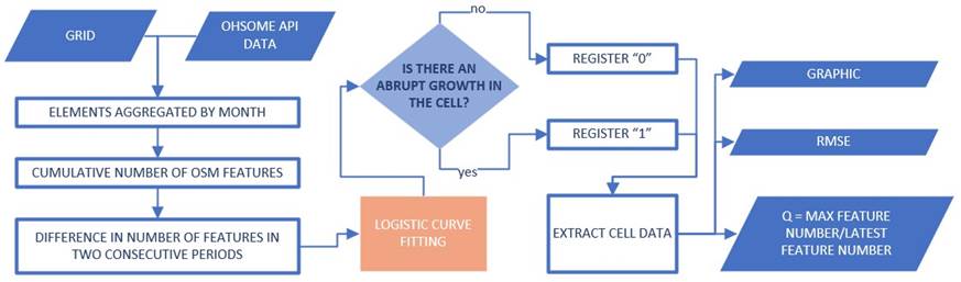 The OHSOME Application Programming Interface (API), at https://api.ohsome.org, was used to obtain the number of features inserted over time into OSM. This API allows the extraction of the history of feature editions in OSM, the number of contributors in a specific area or set of features, adding up the information, and even obtaining the set from specific feature categories. Python was used as the programming language was Python, and software QGIS 3.x was used for data gathering and manipulation. The API documentation makes explicit that data extraction must be accomplished through specific queries by delimiting the geographic coordinates in the region of interest. Then, an interactive process that takes the cell’s bounding box as input calculates the contribution data and performs mathematical modelling for each. From the contribution history accumulated over time, data modelling was accomplished through a four-parameter logistic regression, as shown in Equation 1.