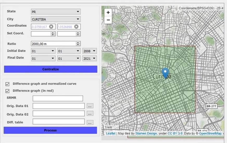 Considering the interface in Figure 5, the user can select the target municipality and insert the geographic coordinates of the region of interest and the length of the enclosing rectangle from which the data will be obtained. Finally, the target interval and path to store the lists with the results were selected. The interface icons were derived from PyQT and developed using qt designer, in addition folium, for visualizing the base map. The developed scripts are available for downloading in the GitHub online repository.