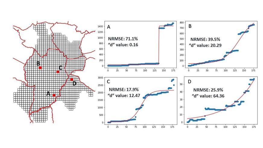 In addition, three cells (represented in gray in Figure 14) failed in the NRMS calculation, as the median was zero. The curve failed to model the contributions in these regions because of the low amount of data input and accumulated growth without a typical pattern. As explained in the previous analysis of Figure 7, even if it is not an abrupt jump, regions with few features or unusual contribution behavior over time can also present this behavior. After address filtering, the overflow no longer appeared in Curitiba, which is comparable to the pattern observed in the other NUC regions (Figures 8 and 10). This last analysis also reinforces the use limitation of the presented method for areas where the number of contributions and their behavior are compatible with the logistic curve.